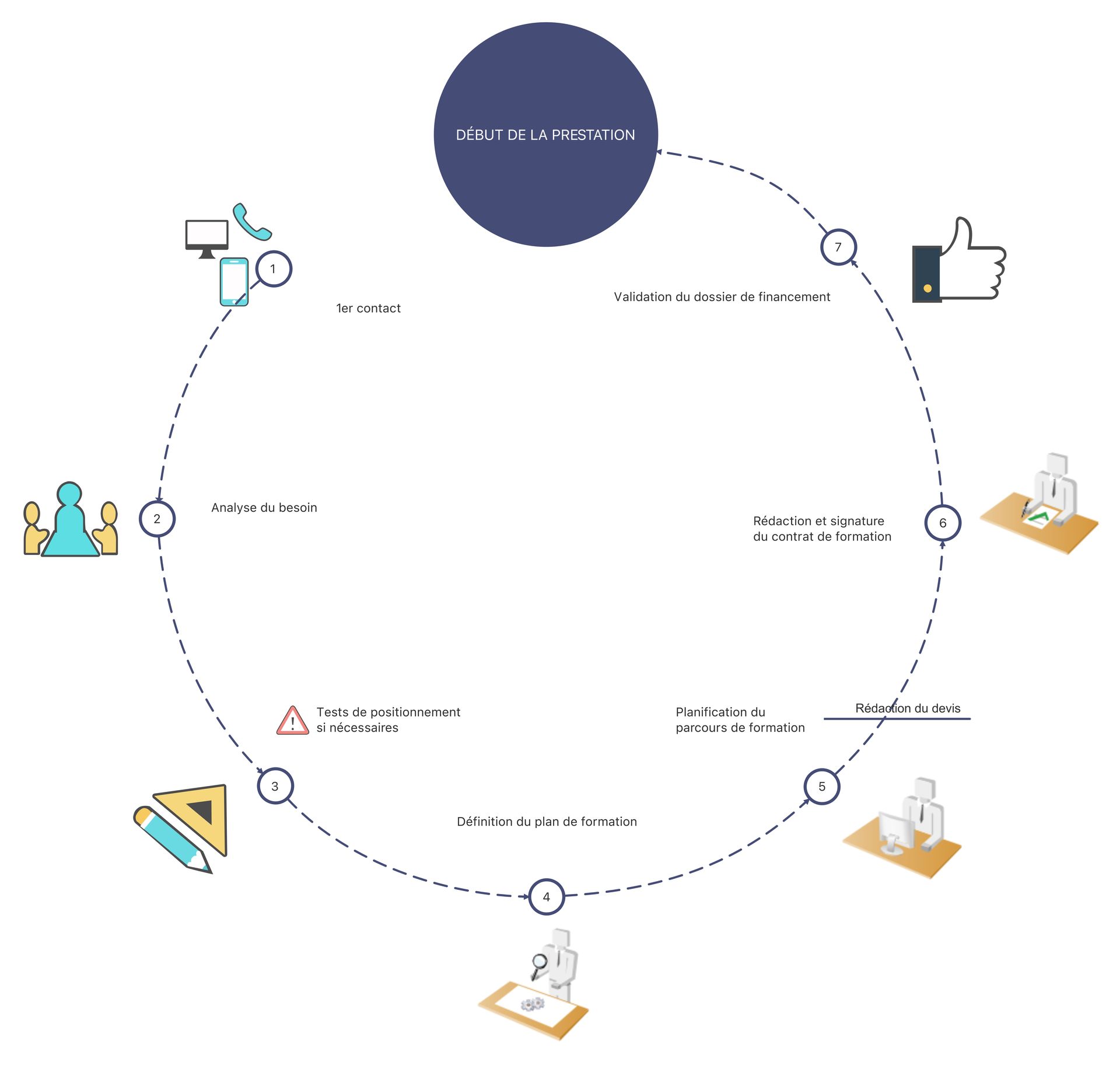 Pour la VAE, la prestation débutera par un entretien de validation du projet de Validation des Acquis de l’Expérience. et suite à l'acceptation du dossier par le financeur.